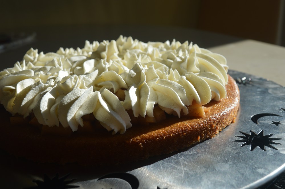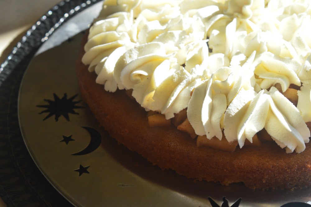 Note: The idea is to have three different textures: Spongy texture from the cake, slightly crunchy bite from the apples (that is why they are not cooked all the way to be soft or even placed to bake along with the cake as the upside down cakes) and soft/silky touch from the whipped cream.