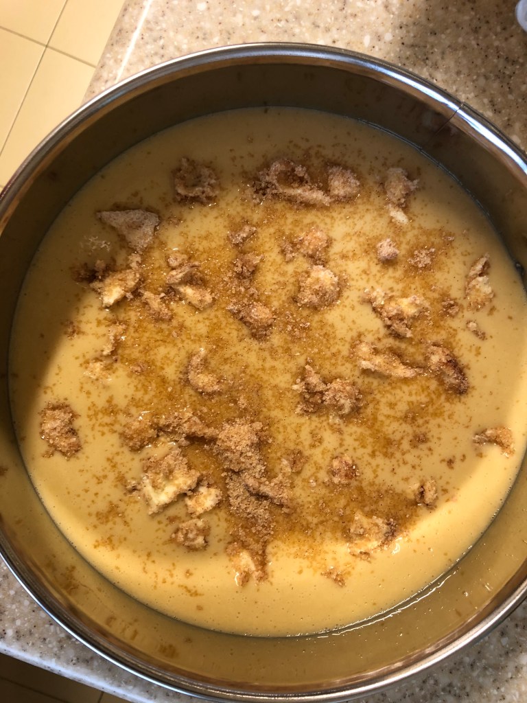 - Pour batter into prepared pan. Tap the pan gently against the counter to release any air bubbles. Drop over the surface the crumble mixture.