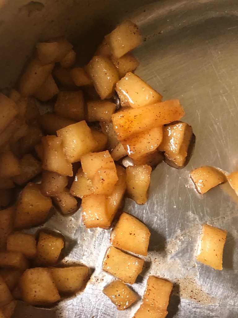 - Once the butter has melted, mix the apples and slowly add sugar and cinnamon.